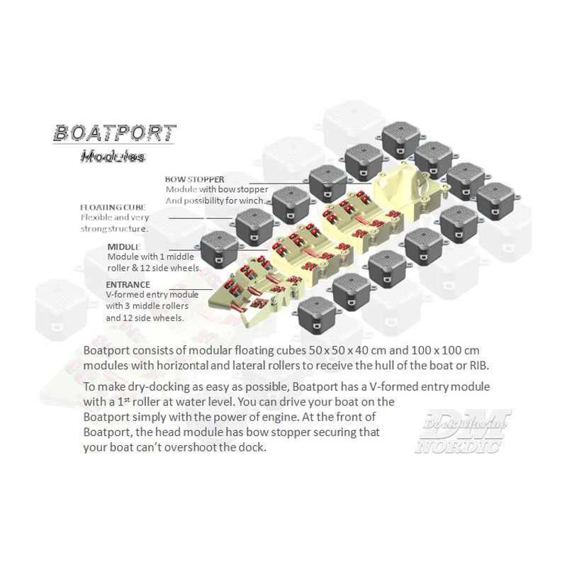 BoatPort består af modulære flyde-kuber med “køl- og sideruller” som hjælper ved op- og nedsejling. Denne flydebro gør det virkelig let at lægge din båd til. Du undgår samtidig at bundmale din båd ofte, da der ikke i lige så høj grad kan komme alger, da båden er løftet op over vandet.